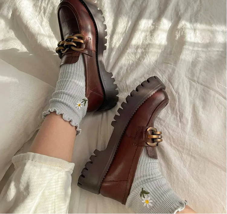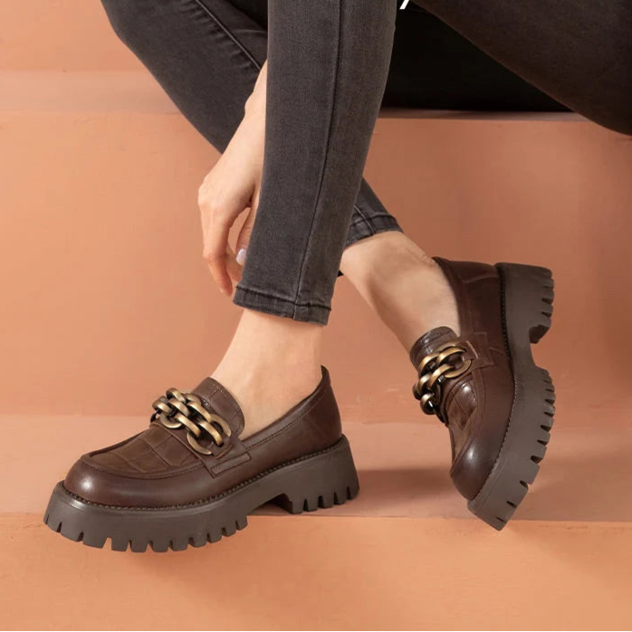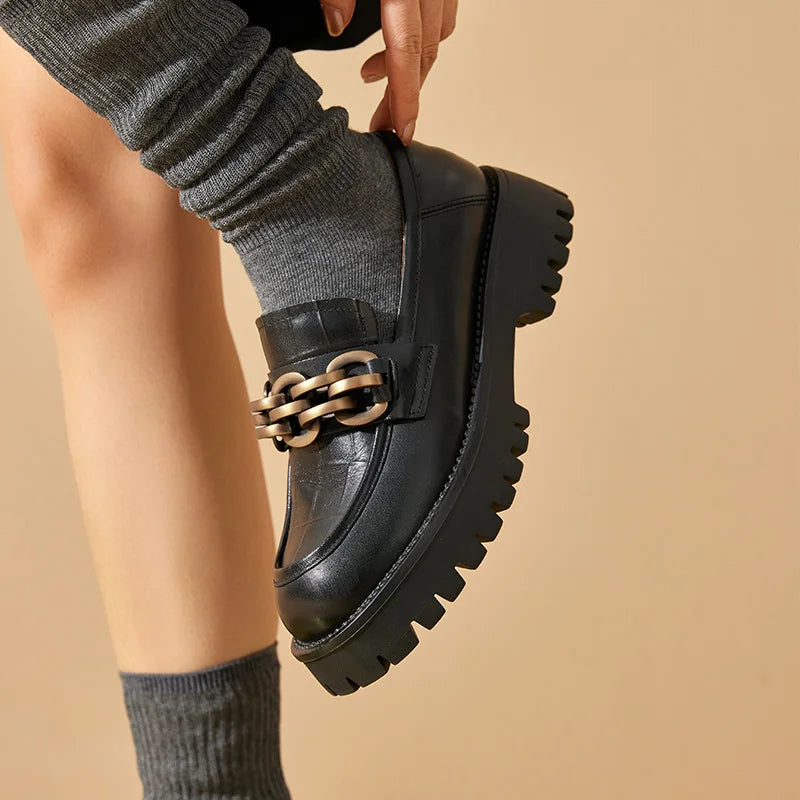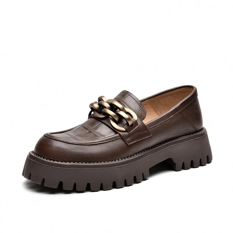 Chunky Women's Genuine Leather Platform Shoes Round Toe Metal Chain Slip on Loafers