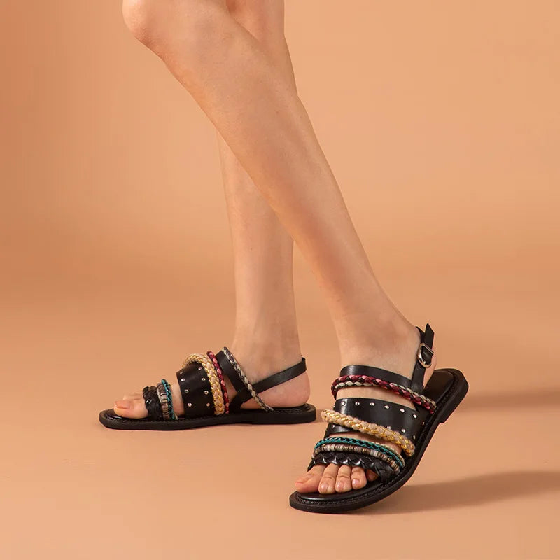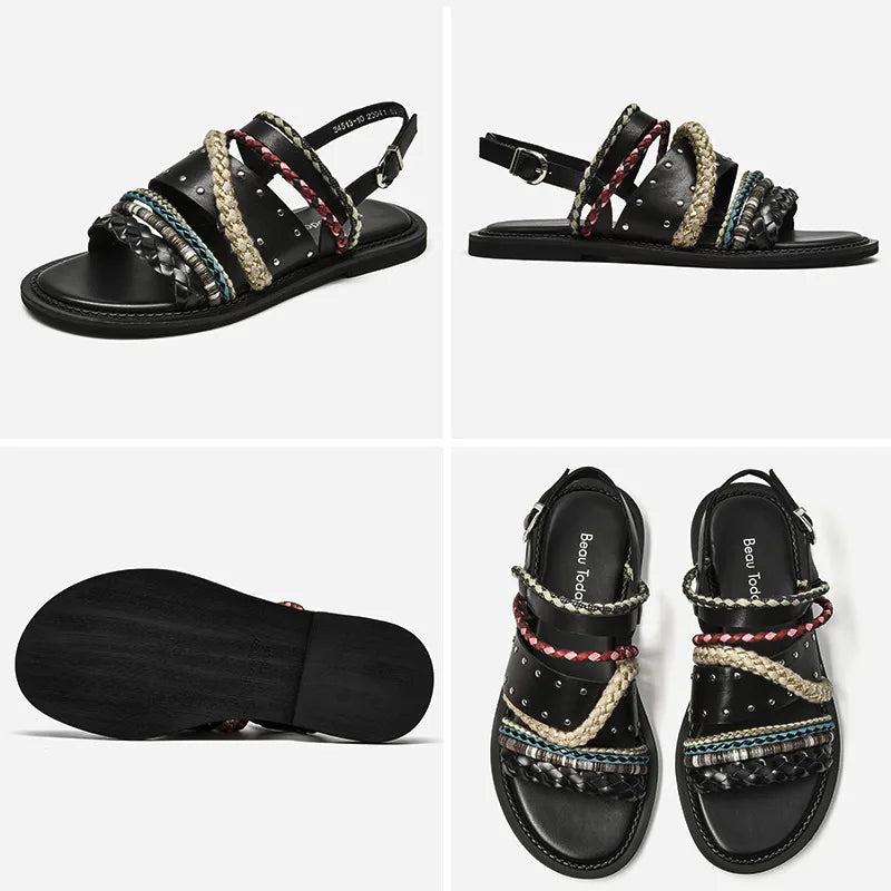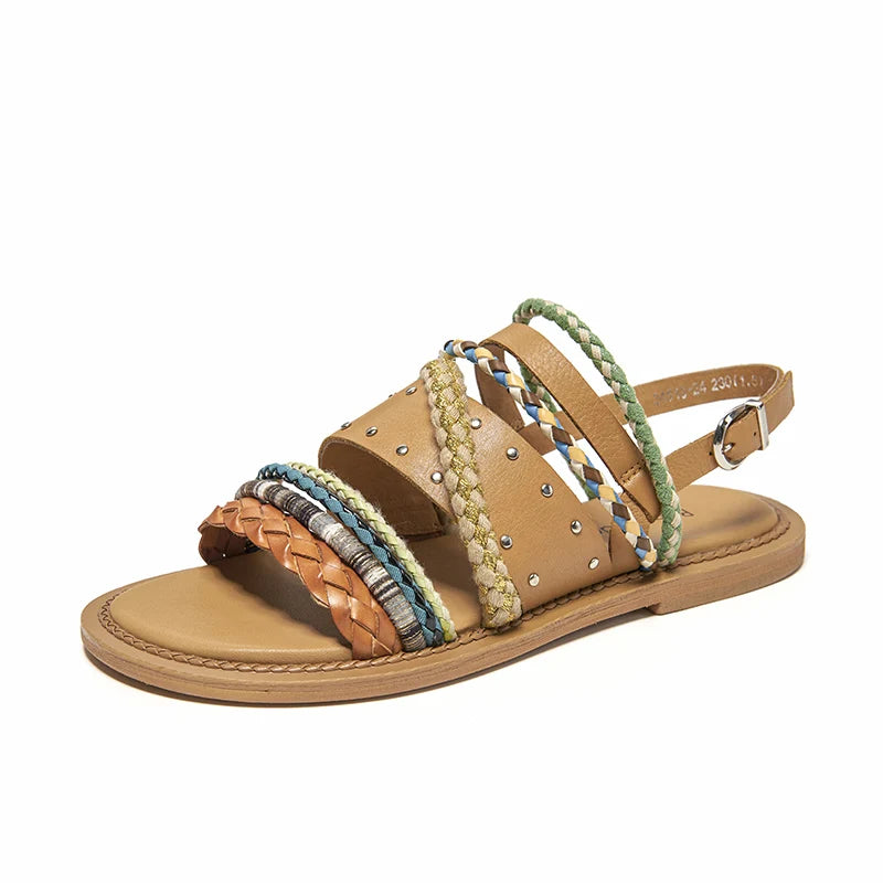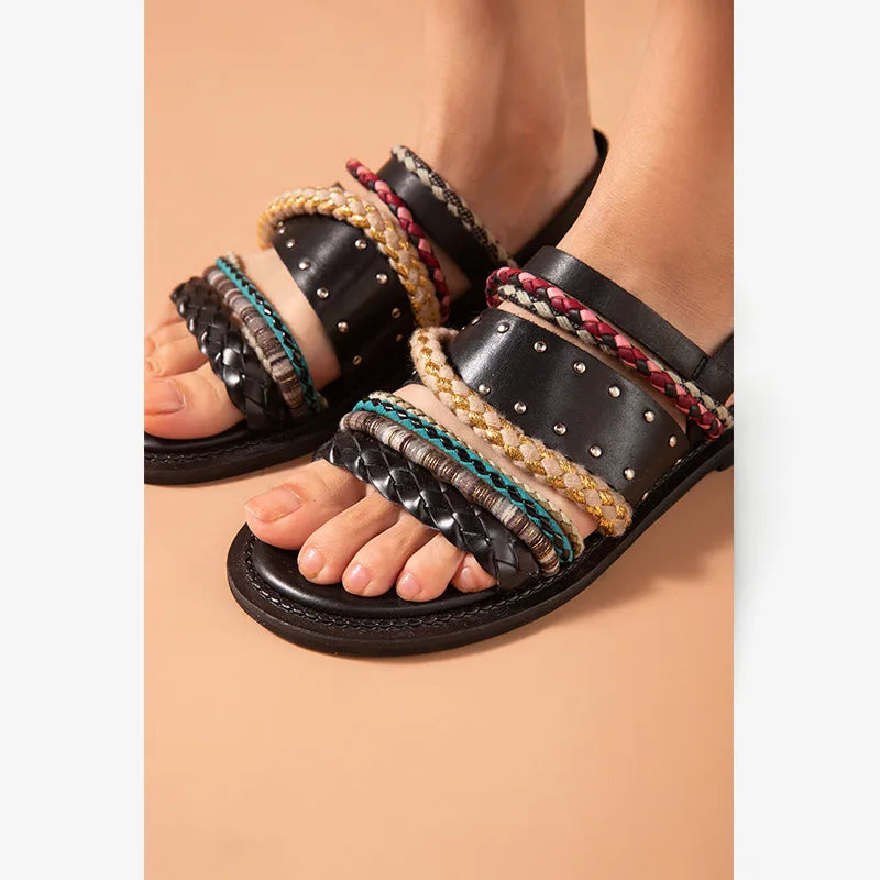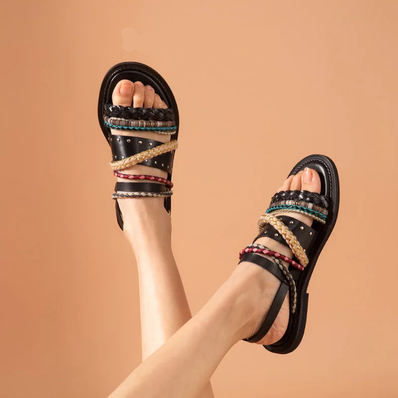 Cow Leather Mixed Color Braided Strap Slingback Sandals