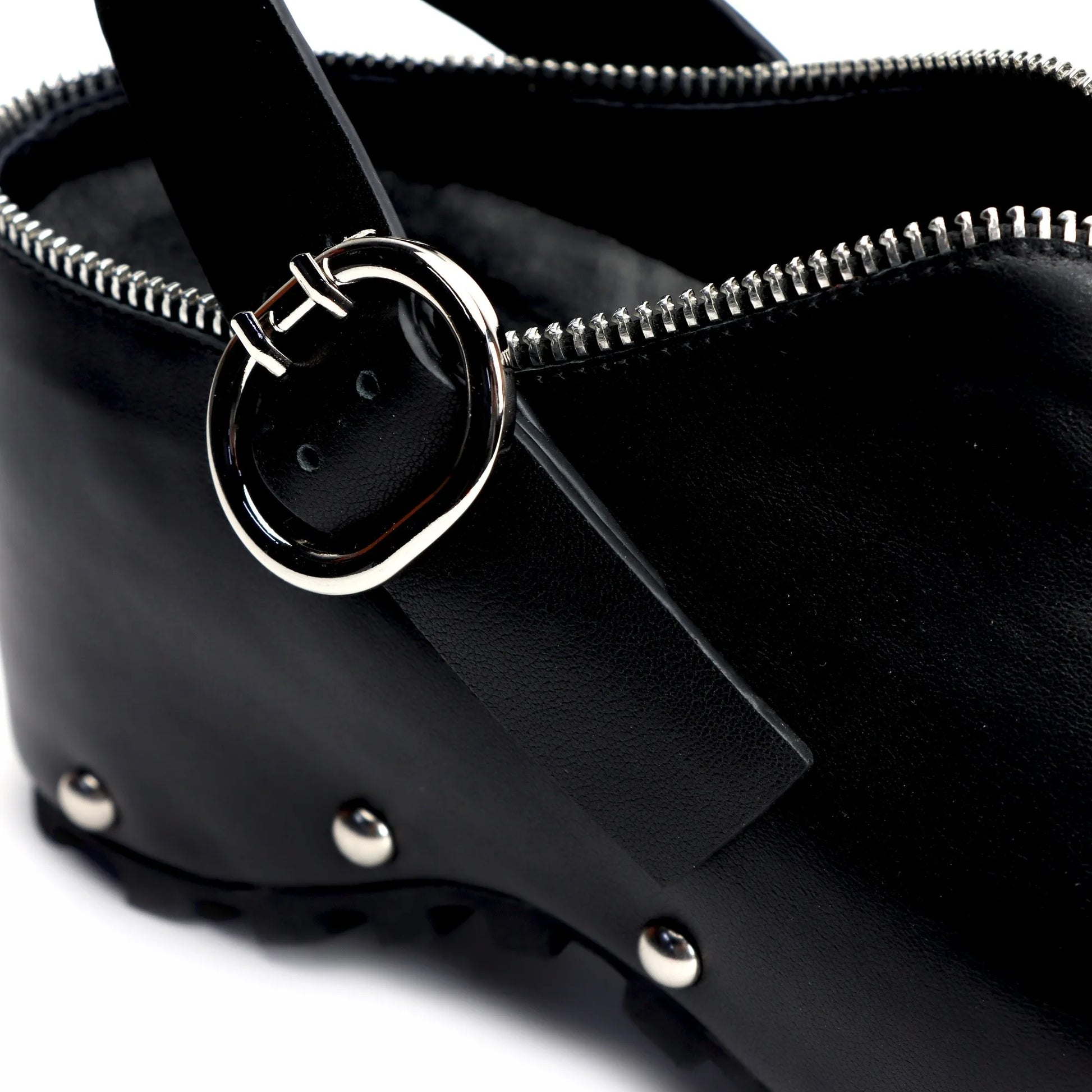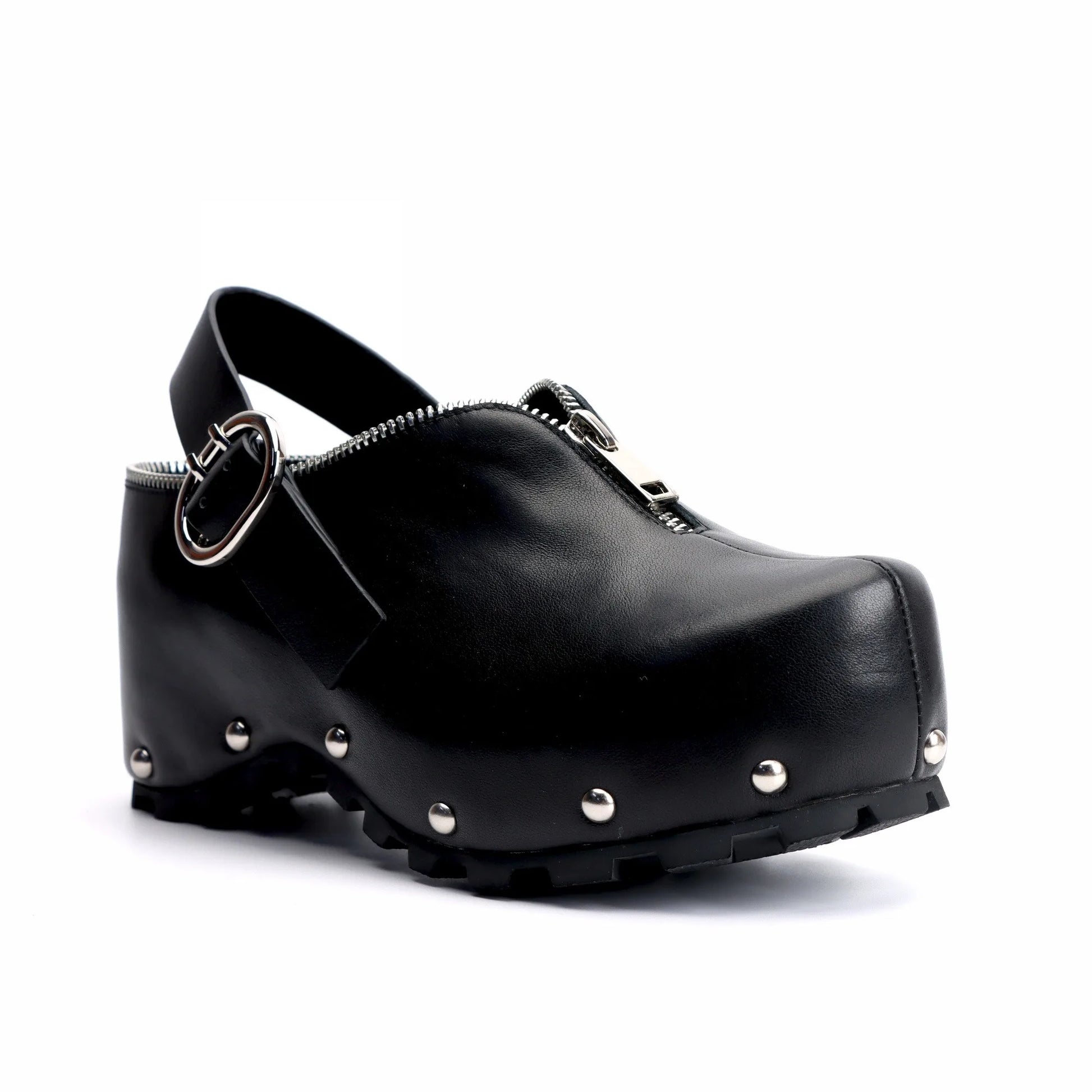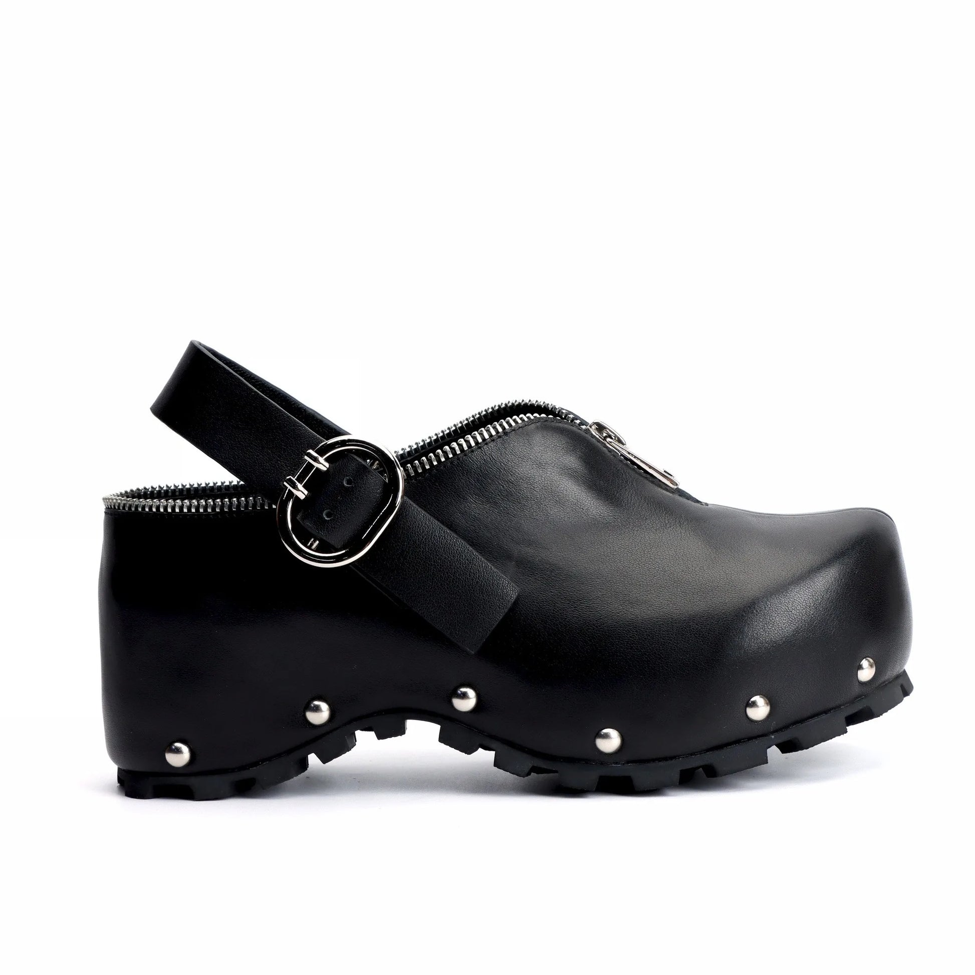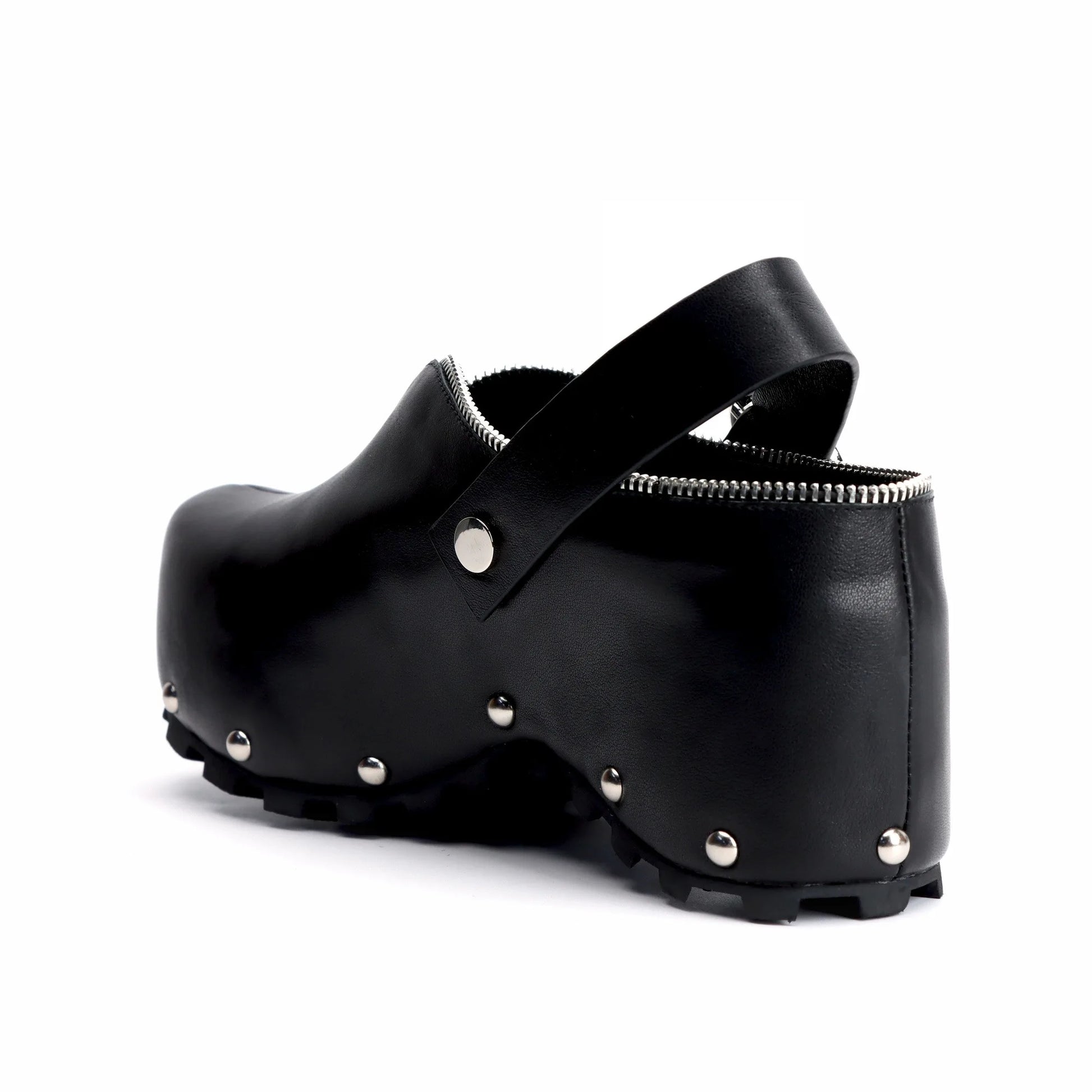 Black Studded Leather Platform Clogs with Arch Support, Zipper Detail