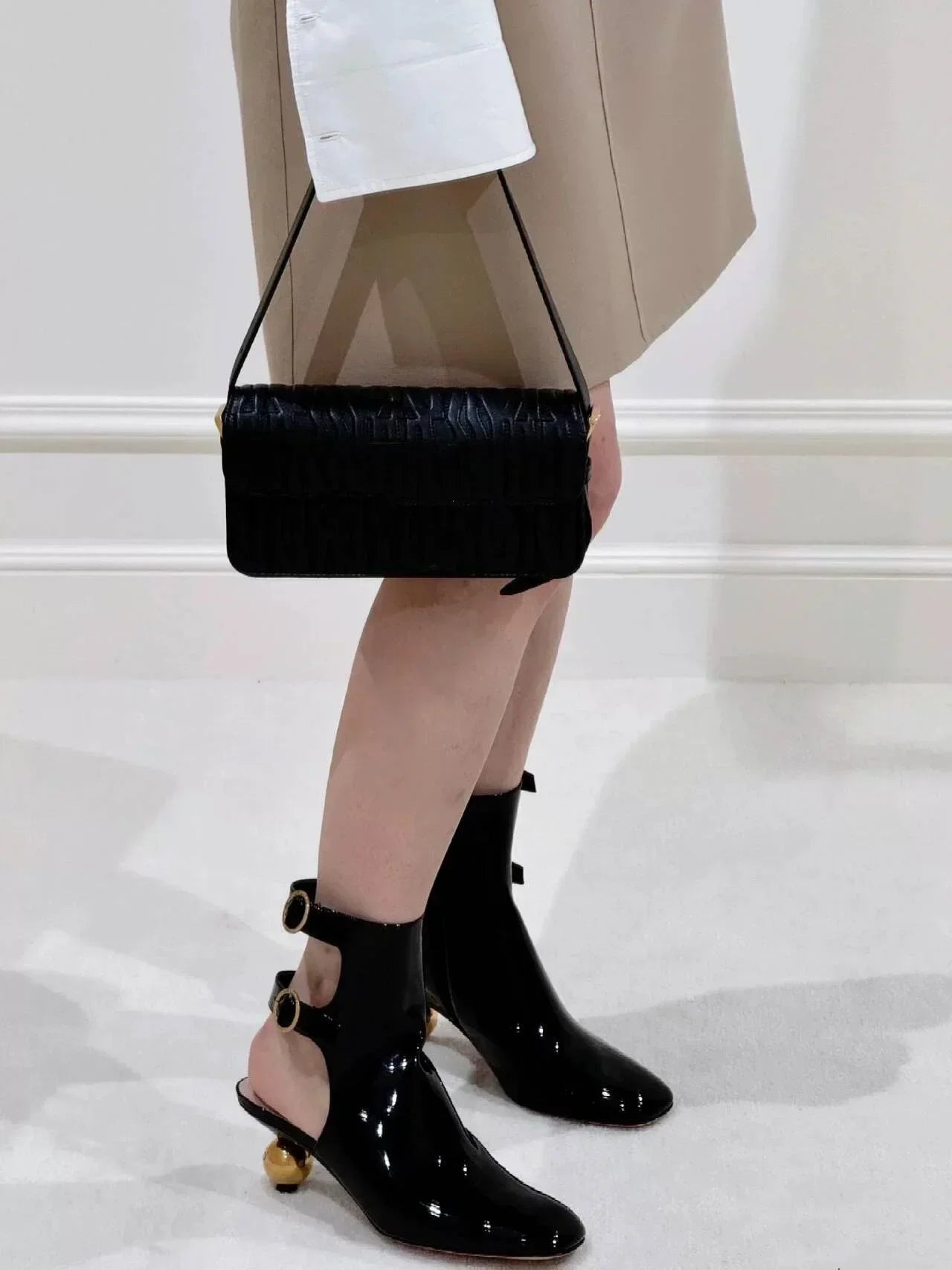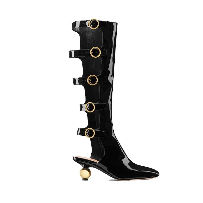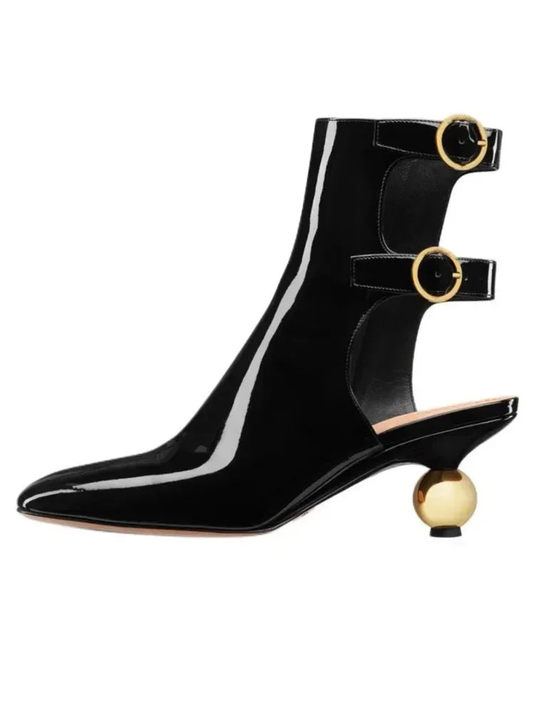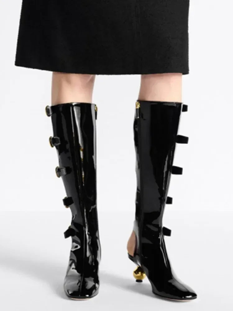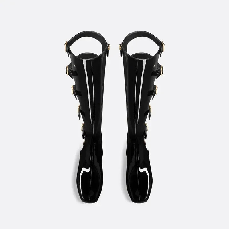 Low Heel Lacquered Leather Boots with Empty Rear Metal Buckle
