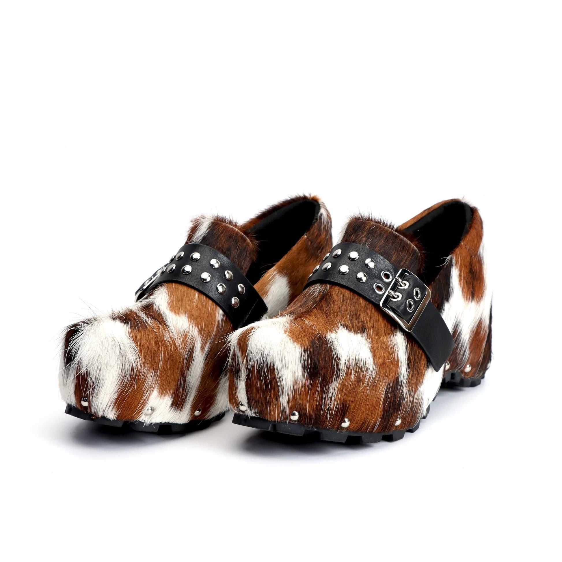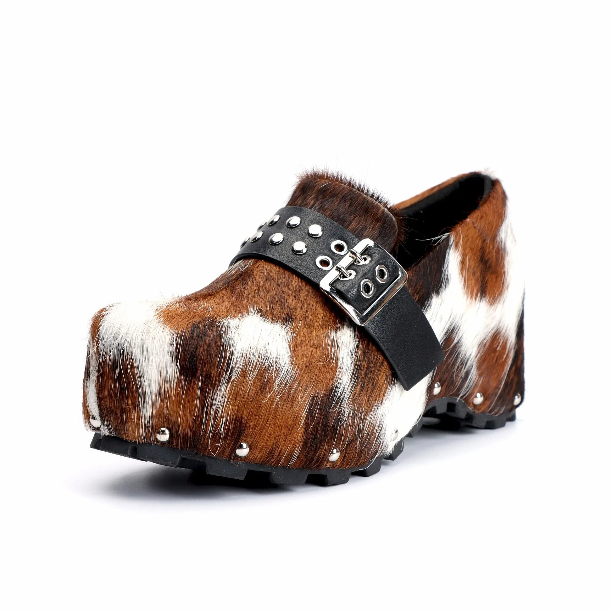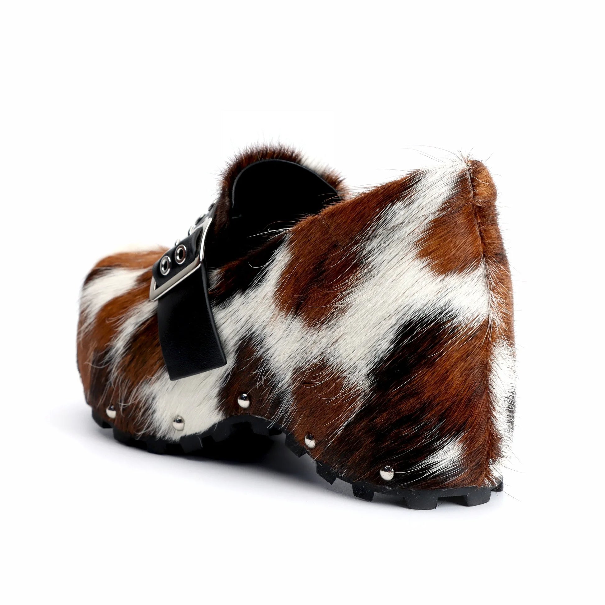 Vintage Punk Western Cowboy Style Handmade Designer Clogs Comfortable Shoes Natural Calf Hair Rivet Trim